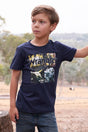 Kids Navy Classic Tee shape, rib neck band, Wrangler iconic logo hem label. 100% Cotton Jersey, 180gsm