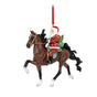 Santa continues to explore alternate modes of transportation in the newest edition Santa ornament. This year he's riding a fine blood bay American Saddlebred, who looks dashing with sparkling hooves and outfitted in gold-trimmed tack. Santa is certainly set to deliver in style, confidently riding the Saddlebred's animated racking gait - complete with a sack of gifts on his back!