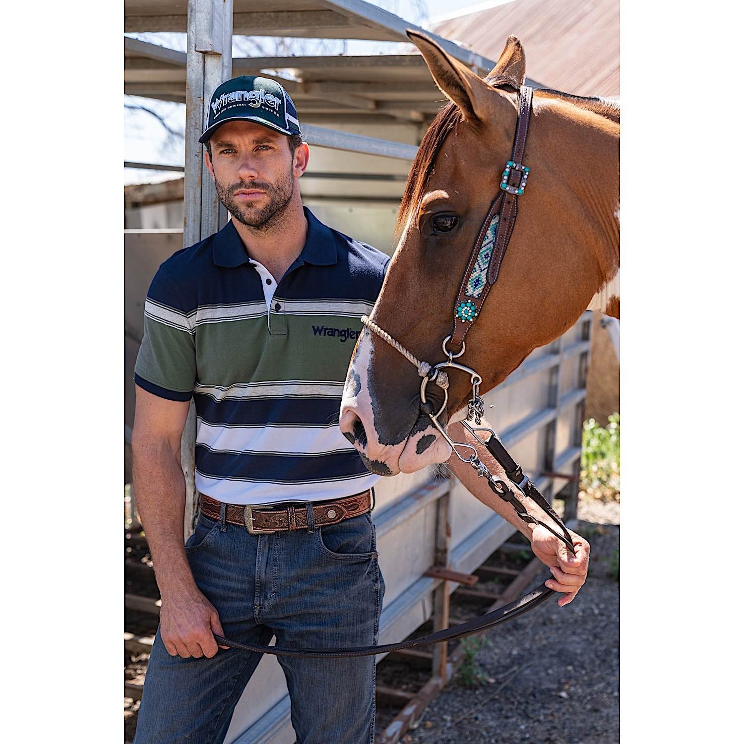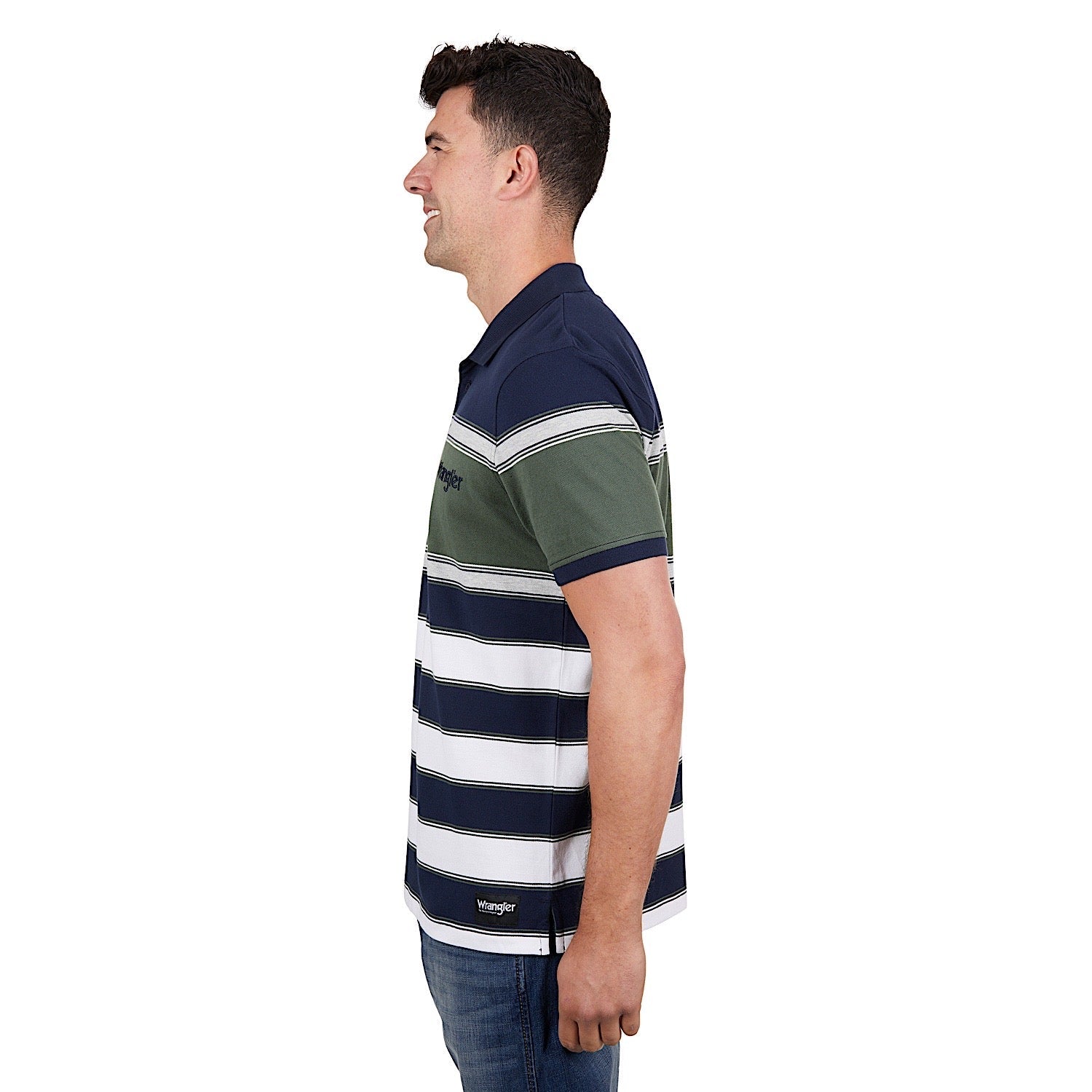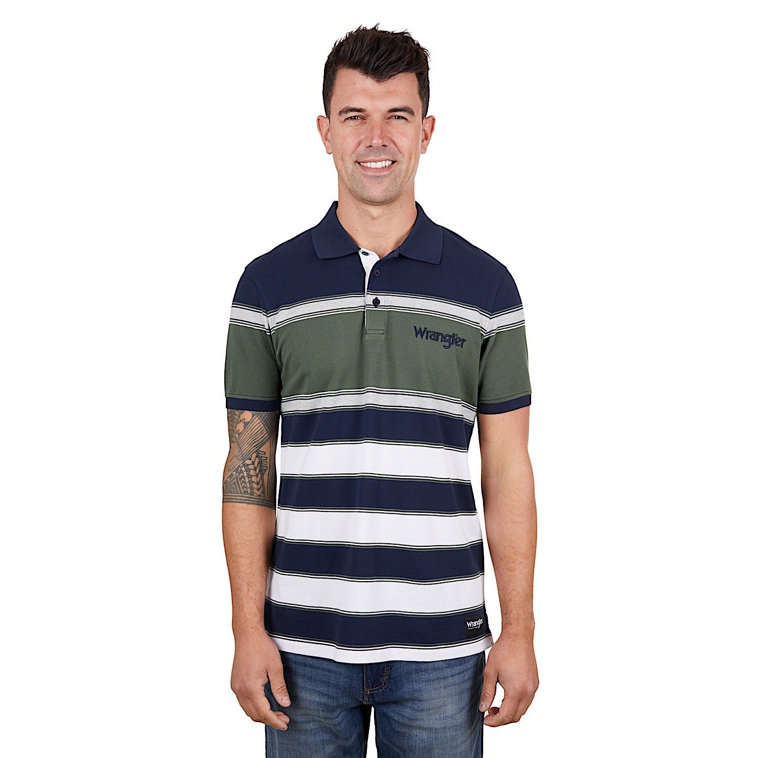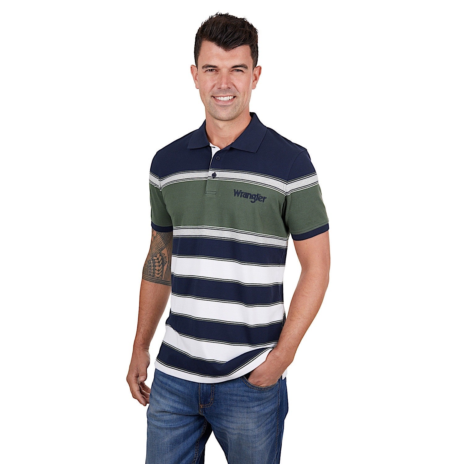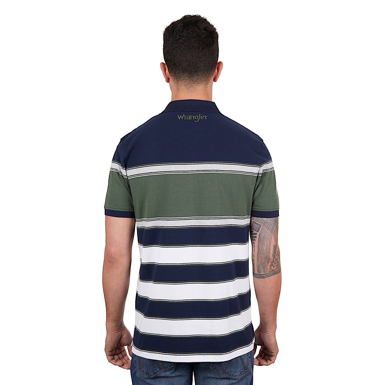 The Wrangler Men's Alex Polo Navy/Cypress is a timeless classic polo silhouette with stripe pattern.