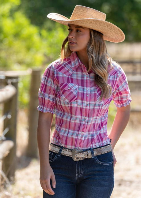 Just Country Australia Abbey Frills Full Button Shirt Musk Pink Lurex Plaid