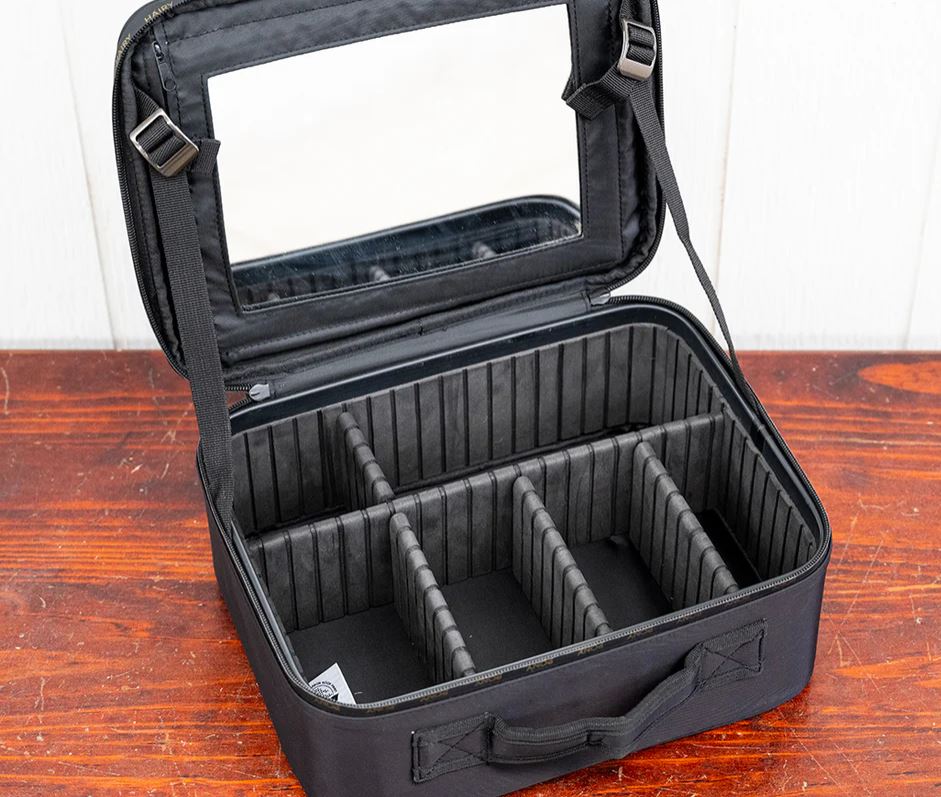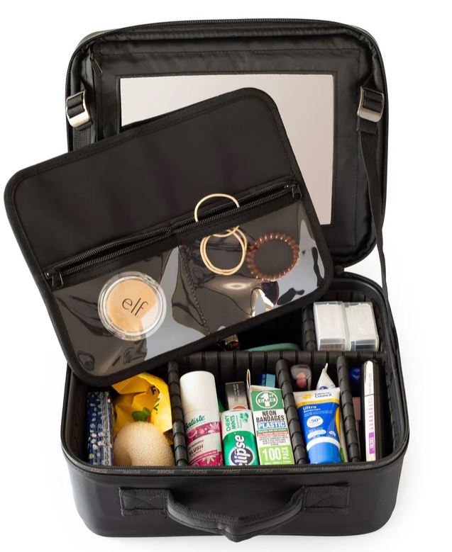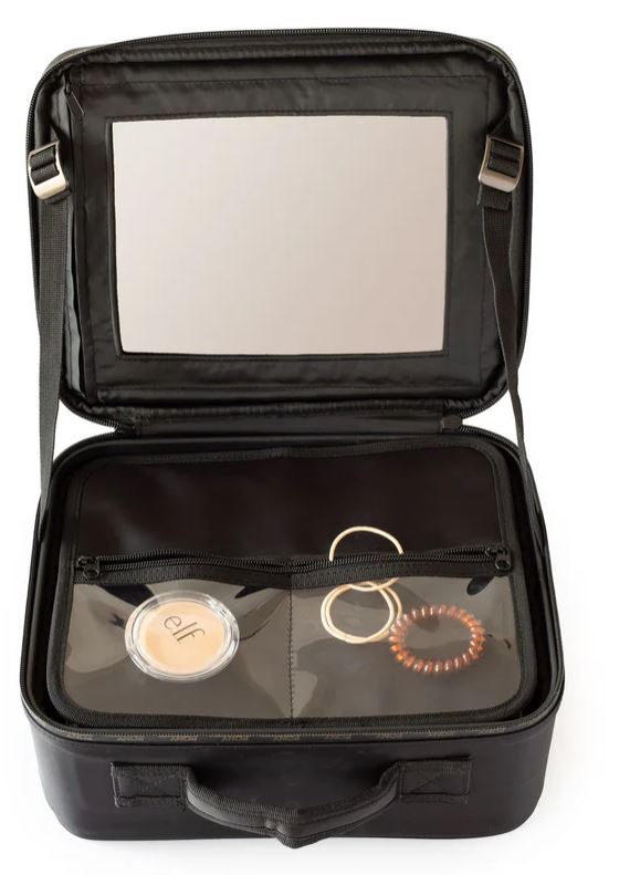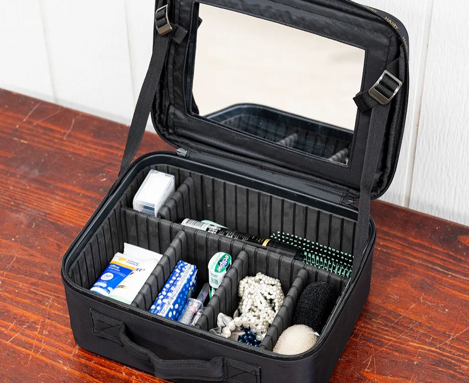 The designated storage case features a built-in mirror, an inner cover with clear pockets, and customisable partitions so you can easily arrange your items exactly how you like them.