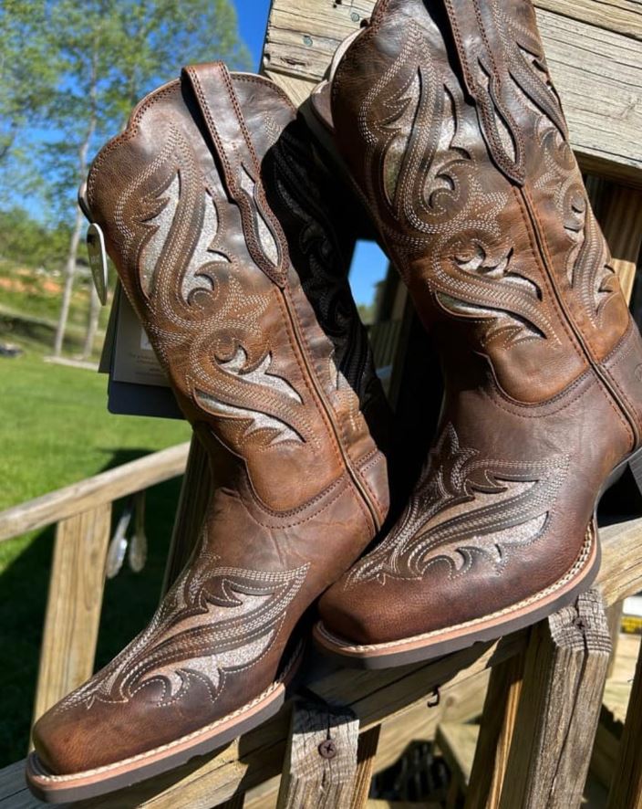 Finely cushioned foot and a fun splash of glitter combined with full-grain leather featuring precision laser cutouts. Our Round Up Bliss boot has all of this going for it and more.